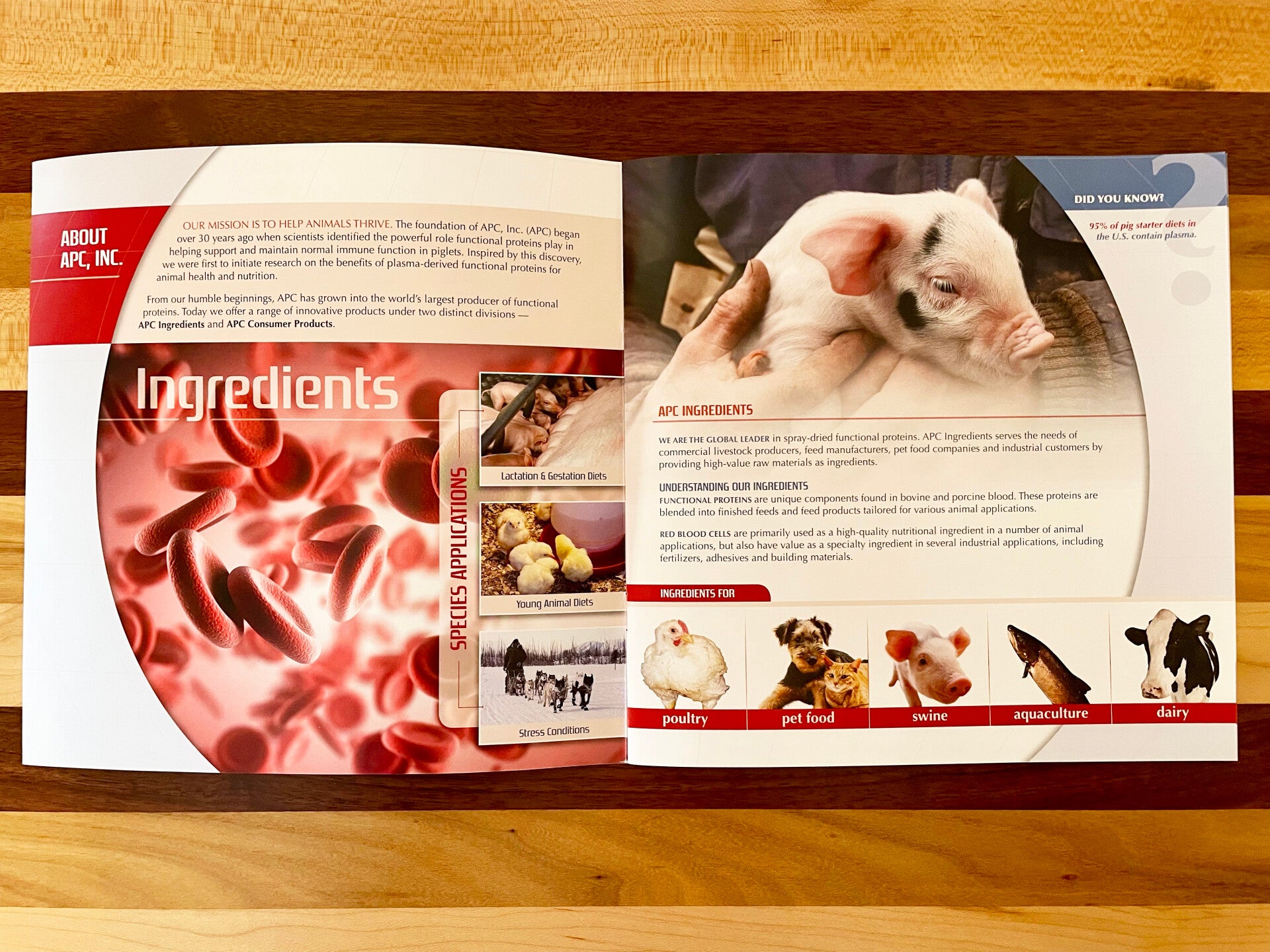 This booklet gave an overview of an animal sciences company in an informative yet visual manner. As seen below, the physical version featured an additional foldout page plus pocket folder at the back for secondary literature.