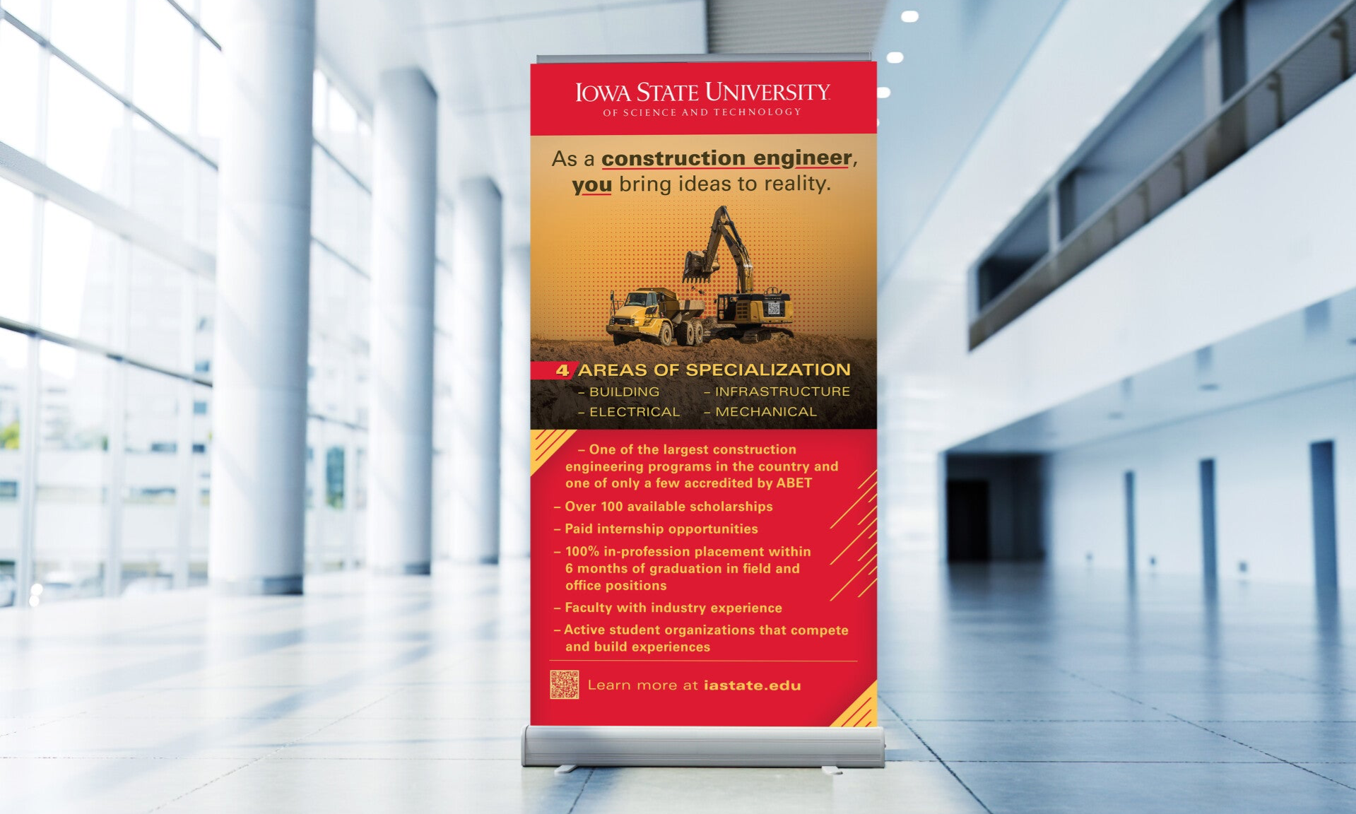 Featuring bold brand colors and striking photography, with linework elements integrated for further visual interest, this banner promotes construction engineering at Iowa State University and was created to be used at prospective student-related events for recruiting purposes.